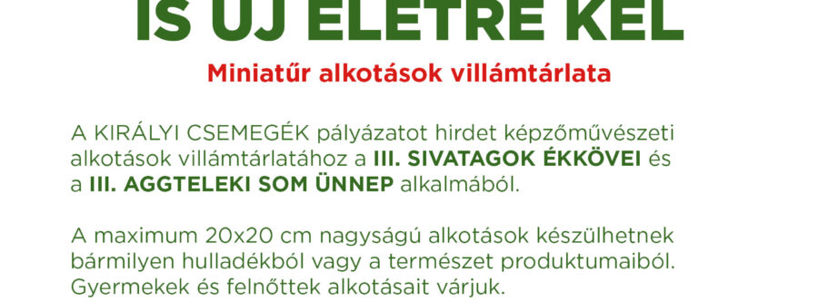 Az aggteleki Királyi Csemegék pályázatot hirdet képzőművészeti alkotások készítésére, melyeket a nyáron megrendezésre kerülő III. Sivatagok ékkövei és a III. Aggteleki Som Ünnep alkalmából mutatnak be. A legfeljebb 20×20 cm nagyságú alkotások készülhetnek bármilyen hulladékból vagy a természet produktumaiból. Gyermekek és felnőttek egyaránt benevezhetnek a versenybe, a leadási határidő 2025. június 15. A beérkező pályaműveket … Bővebben: „A hulladék is új életre kel” – alkotópályázat