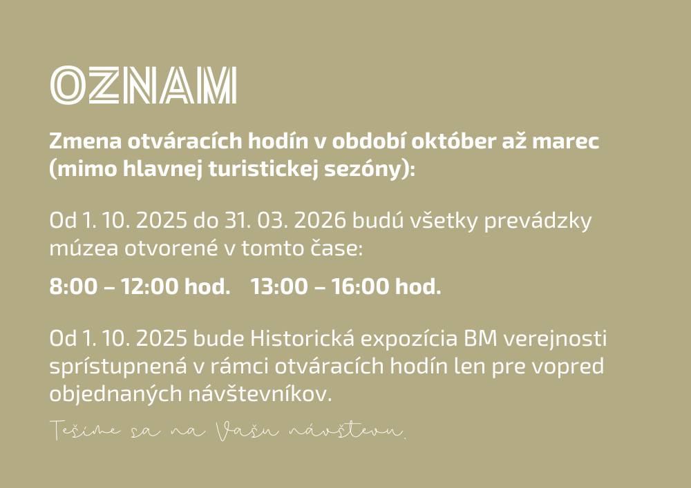 Felhívják továbbá a nyilvánosság figyelmét, hogy a múzeum történelmi tárlata (Šafárik u. 31.) 2025. október 1-től a nyitvatartási idő keretében csak előzetes bejelentkezéssel látogatható. A tárlatlátogatást legalább 2 nappal korábban szükséges egyeztetni a 058/734 37 10-es telefonszámon vagy az alábbi e-mailcímek egyikén: lektor.historia@banmuz.sk, info@banmuz.sk.