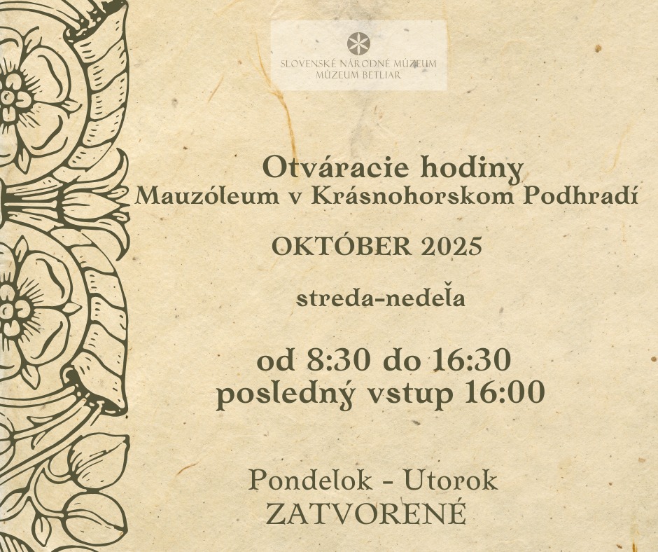 Október folyamán Krasznahorkaváralján az Andrássy-mauzóleum hétfőn és kedden zárva tart, szerdától vasárnapig pedig 8:30 és 16:30 között látoghatható. Az utolsó belépés 16:00 órakor lesz.