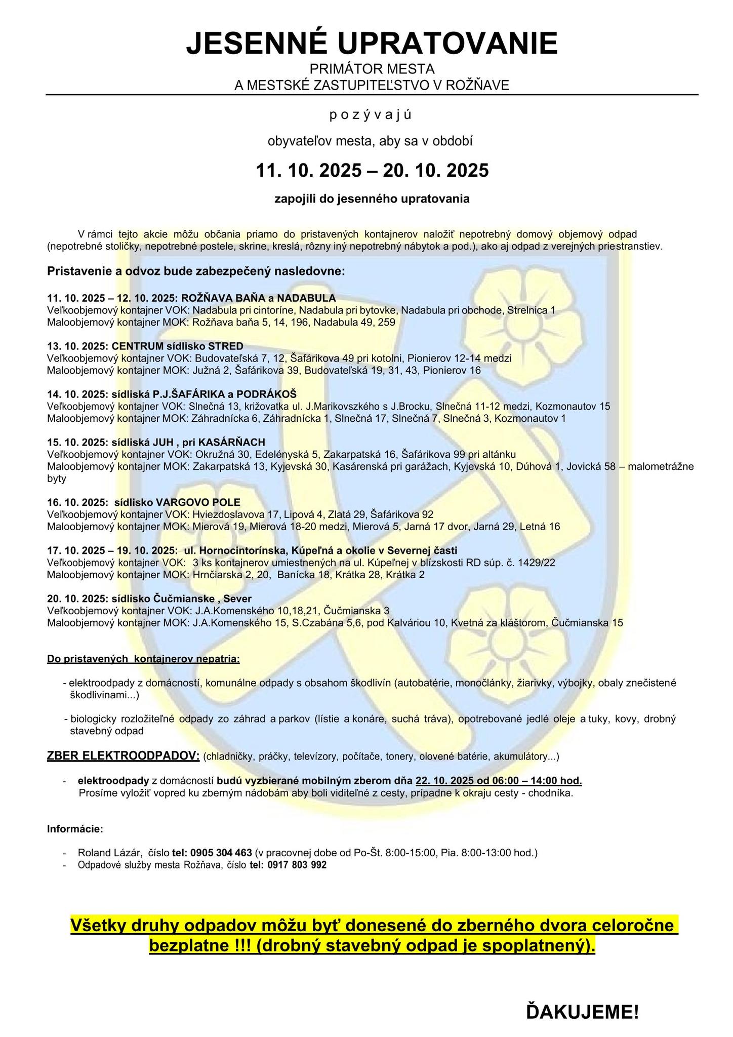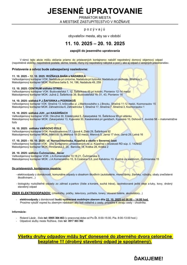 Rozsnyó város vezetése idén is felhívja a lakosok figyelmét, hogy kapcsolódjanak be az őszi nagytakarításba és lomtalanításba. Az akcióra október 11. és 20. között kerül sor – tájékoztatott közösségi oldalán a város.