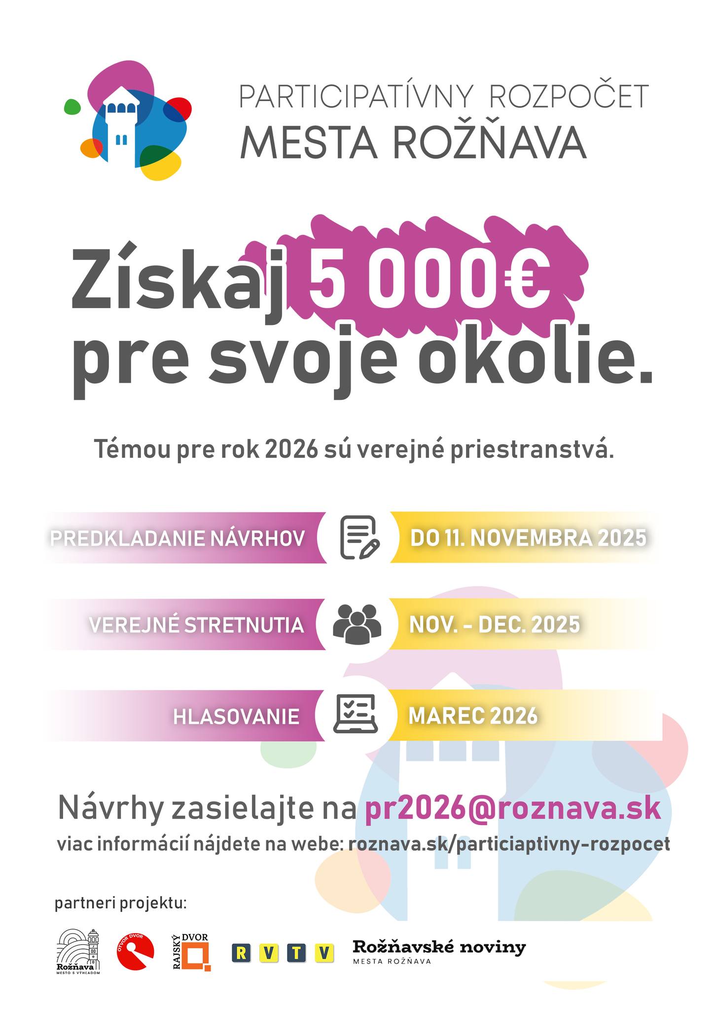 A javaslatokat 2025. november 11-ig várják a pr2026@roznava.sk címre. A város vezetésének képviselői és a pályázók novemberben-decemberben találkoznak a projekt megvalósításának tervezett helyszínén, a részletek megbeszélése ügyében. Decemberben és januárban zajlik a projektek kidolgozása, a konzultációk és a kérvény benyújtása. 2026 februárjában kerül sor a pályázatok ellenőrzésére és elbírálására, majd márciusban a szavazásra. A nyertes ötleteket jövő április és október között kell megvalósítani, végül novemberben zárul a projektek kiértékelése és elszámolása.