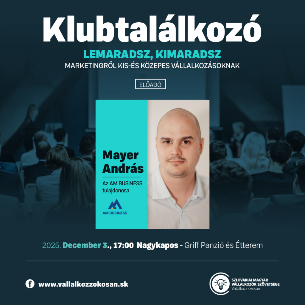 A Szlovákiai Magyar Vállalkozók Szövetsége 2025 decemberében Nagykaposon rendezi meg soron következő vállalkozói klubtalálkozóját, amelynek központi témája: „Lemaradsz, kimaradsz – Marketing kis- és közepes vállalkozásoknak.”
