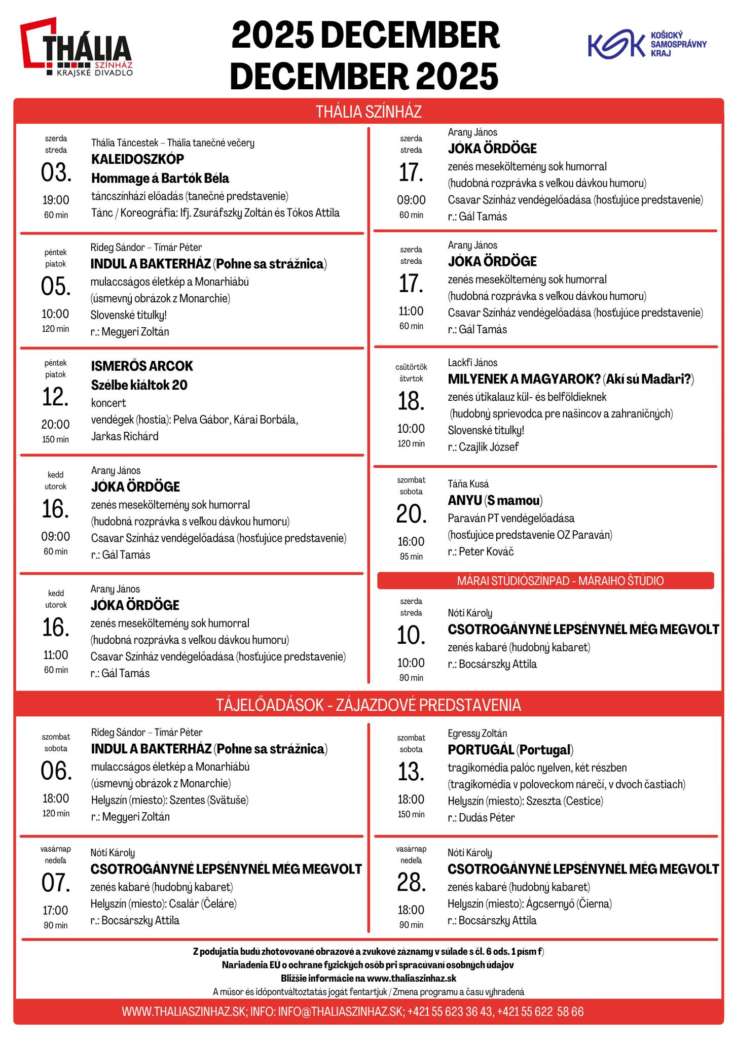 Változatos programot kínál az év utolsó hónapjára a kassai Thália Színház, a saját darabok mellett lesz táncszínházi produkció, koncert és meseelőadás is.