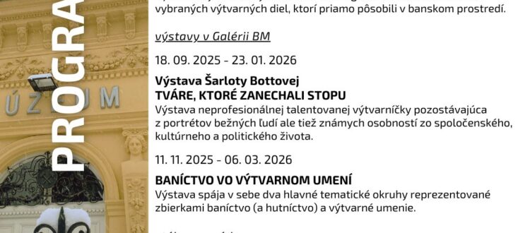 Az állandó bányászati-kohászati, természetrajzi, a bányászati szállítóeszközöket és gőzgépeket bemutató tárlatok, valamint a történelmi és regionális képzőművészeti tárlat mellett két kiállítás is látogatható ebben a hónapban. Az egyik Šarlota Bottová Tváre, ktoré zanechali stopu (Arcok, melyek nyomot hagytak) című kiállítása, melyet még január 23-ig megtekinthetnek az érdeklődők.