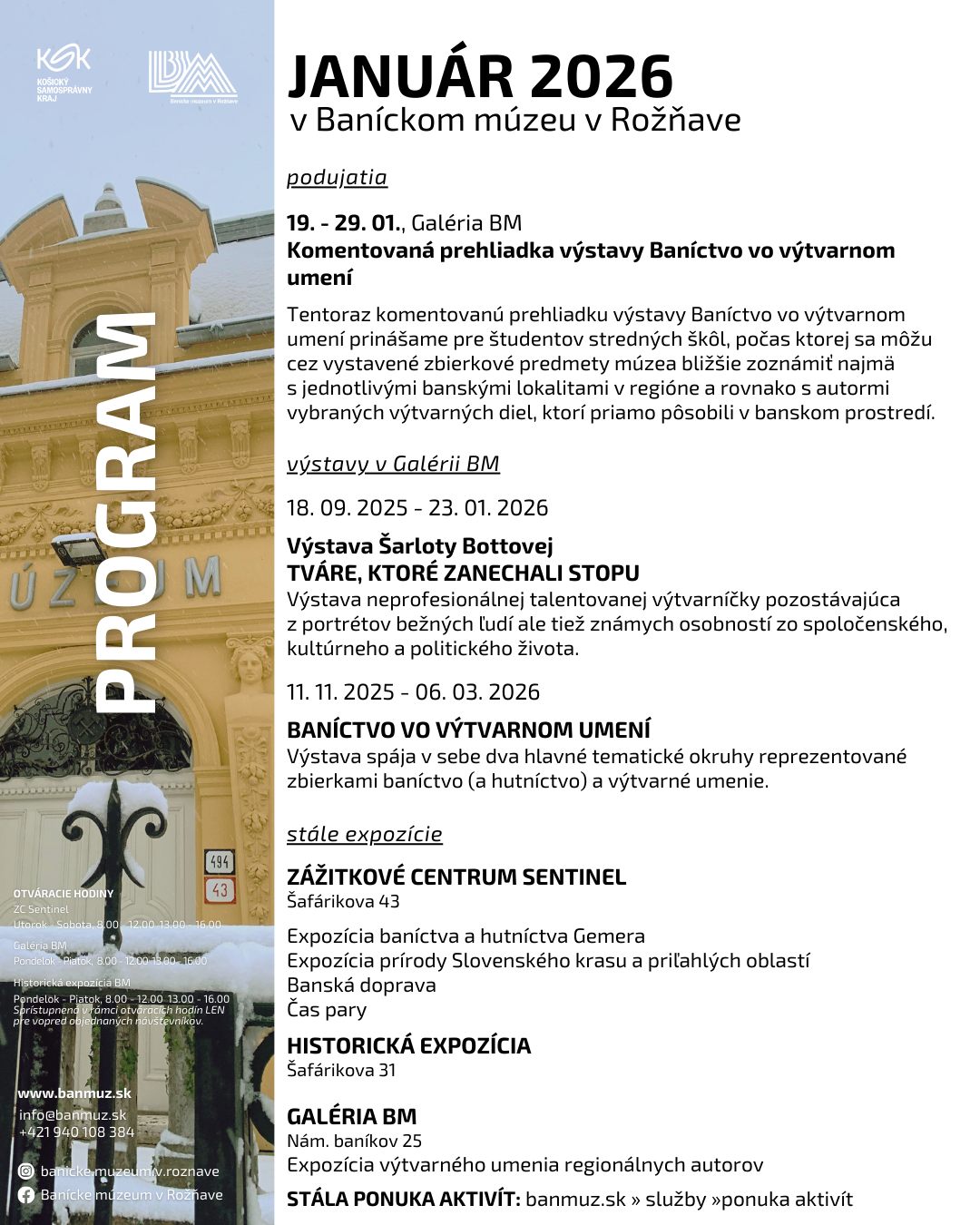 Az állandó bányászati-kohászati, természetrajzi, a bányászati szállítóeszközöket és gőzgépeket bemutató tárlatok, valamint a történelmi és regionális képzőművészeti tárlat mellett két kiállítás is látogatható ebben a hónapban. Az egyik Šarlota Bottová Tváre, ktoré zanechali stopu (Arcok, melyek nyomot hagytak) című kiállítása, melyet még január 23-ig megtekinthetnek az érdeklődők.