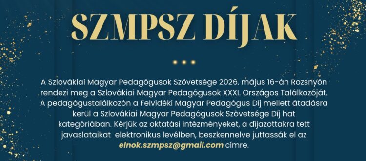 Szlovákiai Magyar Pedagógusok XXXI. Országos Találkozóját. A pedagógustalálkozón hagyományosan a Felvidéki Magyar Pedagógus Díj mellett átadásra kerülnek az SZMPSZ Díjai is, ez utóbbi elismerés idén egy új kategóriával bővült. A pedagógusszövetség február 28-ig várja a díjazottakra vonatkozó javaslatokat.