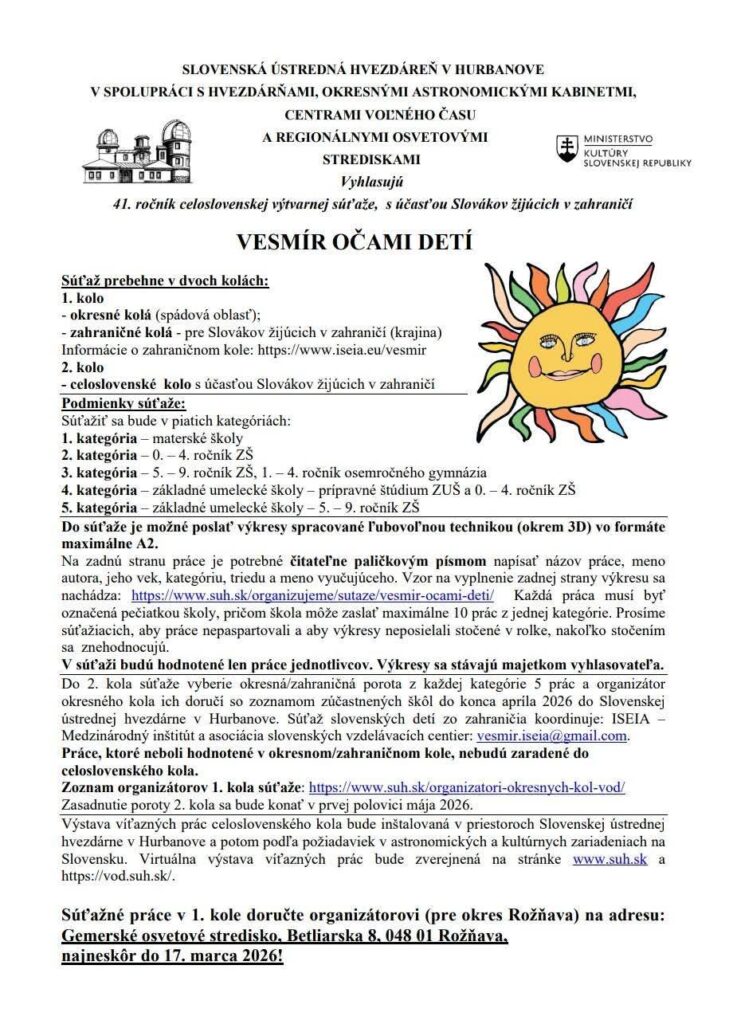 A Rozsnyói járásból benevező óvodáknak és iskoláknak a regionális szervező, a Gömöri Művelődési Központ (GOS) címére kell eljuttatniuk a képzőművészeti alkotásokat legkésőbb 2026. március 17-ig.