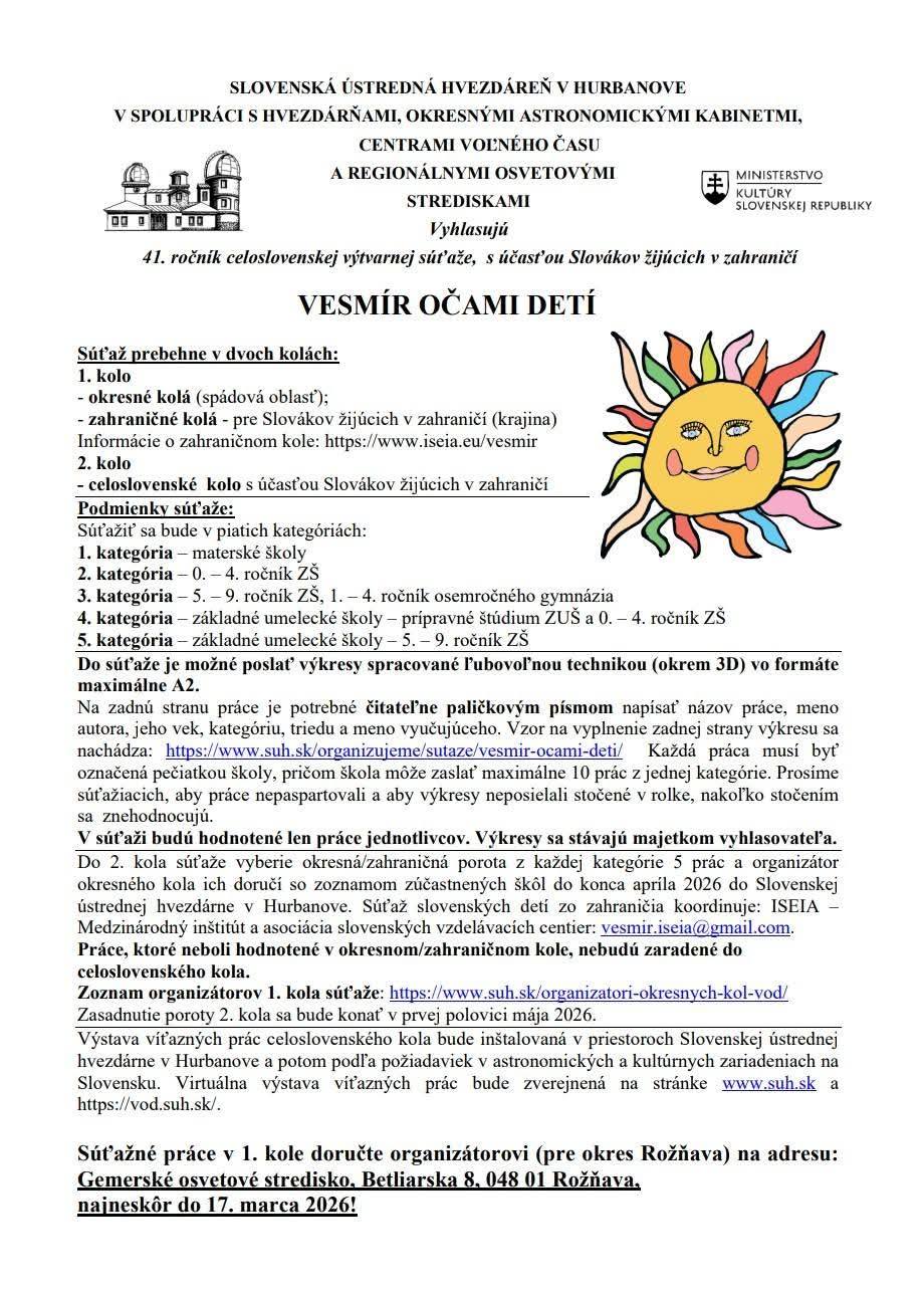 Az országos döntőbe a járási fordulók, illetve határon túli szlovák lakta régiók zsűrije minden kategóriából 5 alkotást választ ki, amit a járási szervezők április végéig eljuttatnak az Ógyallai Központi Csillagvizsgálóba. A 2. forduló zsűrijének ülésére május első felében kerül sor, majd a győztes pályamunkákat kiállítják az Ógyallai Csillagvizsgálóban és virtuálisan is megtekinthetők lesznek a www.suh.sk weboldalon.
