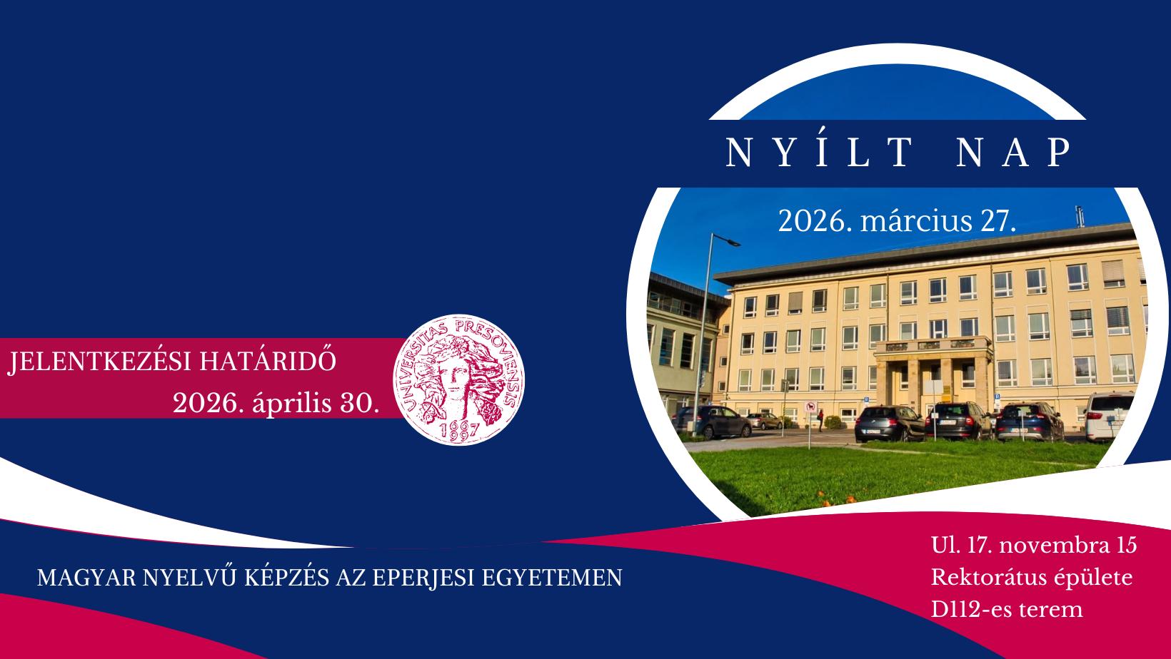 A nyílt nap 2026. március 27-én (pénteken) 9:30-tól kezdődik az Eperjesi Egyetem Rektorátusának épületében (D112-es terem, Ul. 17. novembra 15.) – tájékoztatta portálunkat az intézmény.