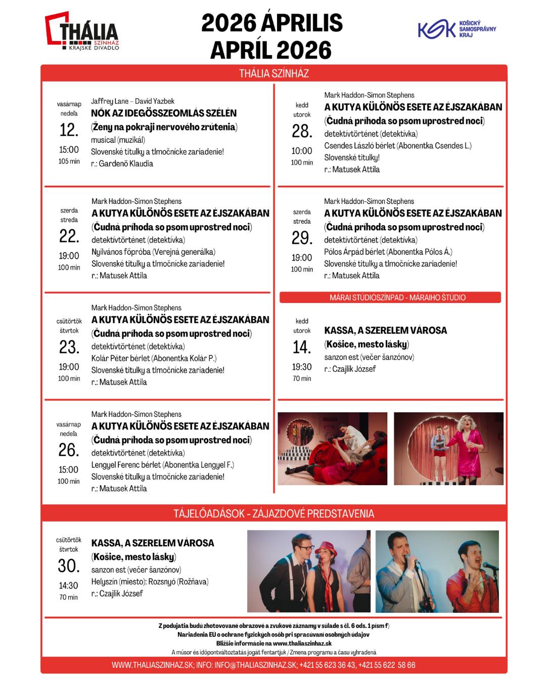 Egy vasárnapi alkalommal még ebben a hónapban is látható a Nők az idegösszeomlás szélén című mediterrán musical. A Czajlik József által rendezett sanzonest, a Kassa, a szerelem városa a Márai Stúdióban kerül színpadra, és jó hír, hogy a zenés előadással hozzánk, Rozsnyóra is ellátogat a Thália, mégpedig április 30-án.