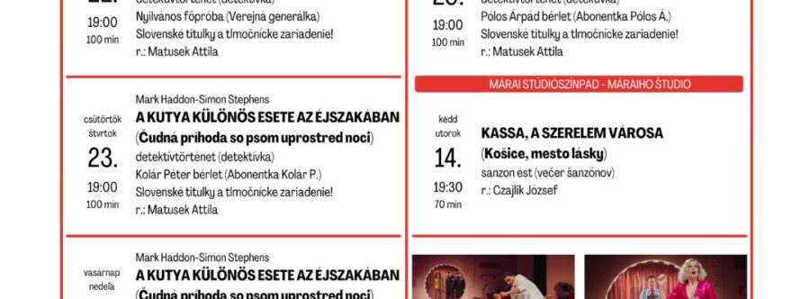 Áprilisban újabb bemutató, A kutya különös esete az éjszakában című detektívtörténet várja a közönséget a kassai Thália Színházban. „Christopher tizenöt éves és más, mint a többiek. Szereti, ha rend van. Szereti, ha úgy van rend amilyennek ő gondolja a rendet. A legfontosabb szabály, hogy nem szabad hazudni. Christopher autizmus spektrumzavarral él együtt. Egy rejtélyes bűncselekmény … Bővebben: A Thália Színház áprilisi előadásai