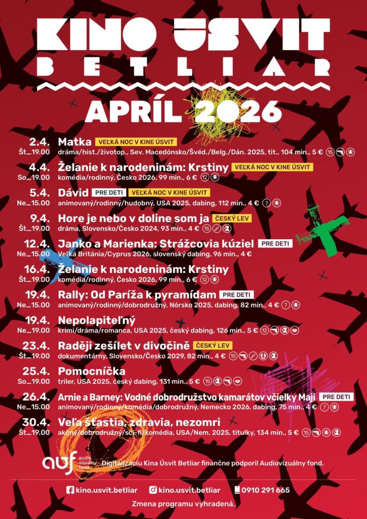 A betléri Úsvit mozi érdekes, színes programot kínál áprilisban is, az életrajzi filmtől a családi vígjátékon, animációs- és dokumentumfilmen át a thrillerig.