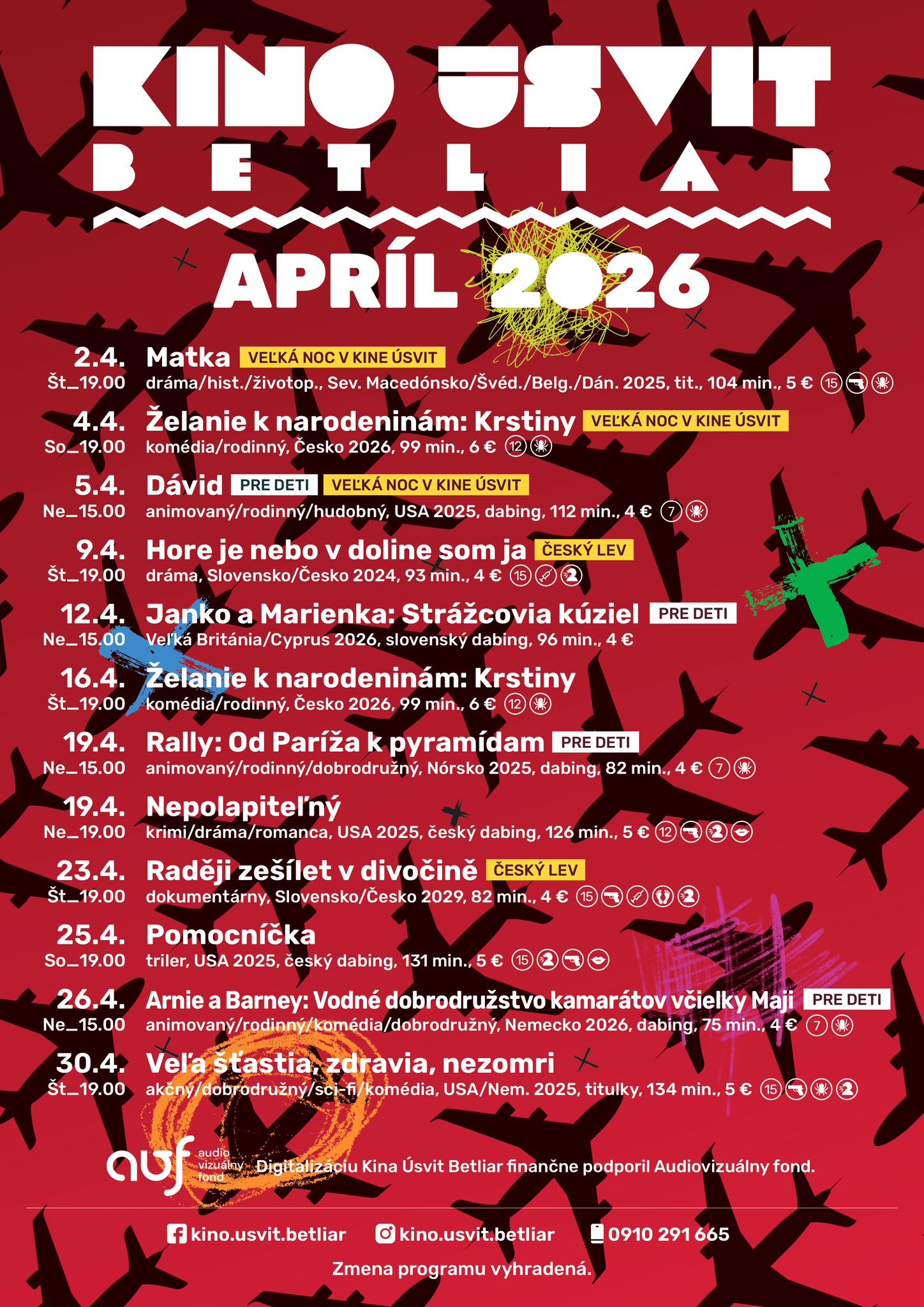 Április 5-én érkezik a Dávid című amerikai zenés animációs film, április 12-én a Janko a Marienka: Strážcovia kúziel, ami a klasszikus Jancsi és Juliska mese hőseit ezúttal kémszerepben mutatja be. Április 19-én a Rally: Od Paríža k pyramídam (Rally: Párizsból a piramisokig) című norvég animációs alkotásban három barát nagy kalandra indul, meg akarják nyerni a legendás autóversenyt. Április 26-án Maja méhecske két ügyetlen és végtelen fantáziával megáldott hangya barátja a vízhiány okait akarja felkutatni az Arnie a Barney: Vodné dobrodružstvo kamarátov Včielky Maji (Arnie és Barney: Maja méhecske barátainak vízi kalandja) című német animációs filmben.