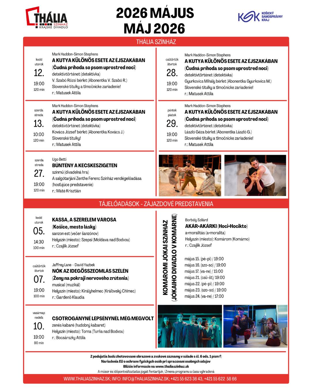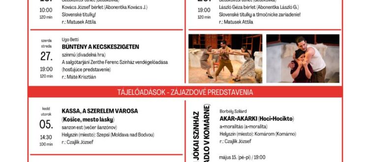 Májusban sem maradnak el a tájelőadások. A Thália Színház csapata népszerű zenés előadásaival Szepsibe, Királyhelmecre és Tornára látogat, a Komáromi Jókai Színházban pedig az Akár•Akárki című darabot adják elő hét alkalommal.