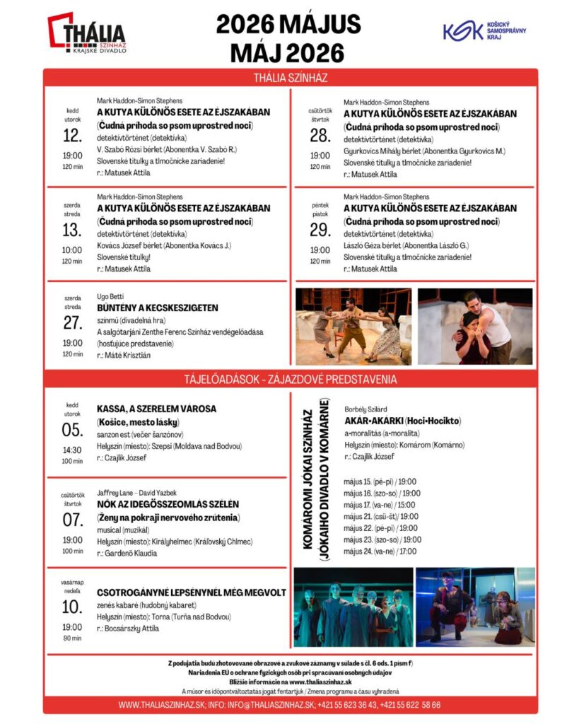 A Marc Haddon világhírű regényéből készült, A kutya különös esete az éjszakában című darabot áprilisban mutatták be Matusek Attila rendezésében. Májusban 12-én, 13-án, 28-án és 29-én látható a Thália színpadán. A salgótarjáni Zenthe Ferenc Színház vendégelőadása, a Bűntény a Kecskeszigeten május 27-én érkezik Kassára.