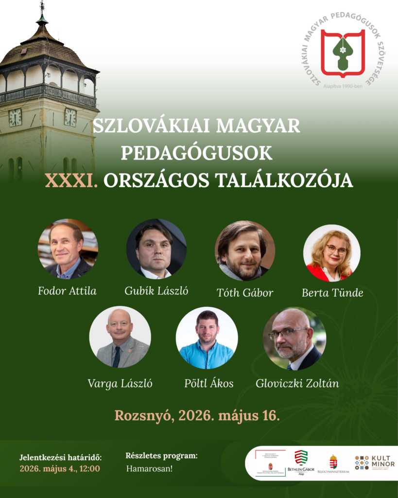 A Szlovákiai Magyar Pedagógusok Szövetsége 2026. május 16-án rendezi meg a Szlovákiai Magyar Pedagógusok XXXI. Országos Találkozóját Rozsnyón, a történelmi városházán.