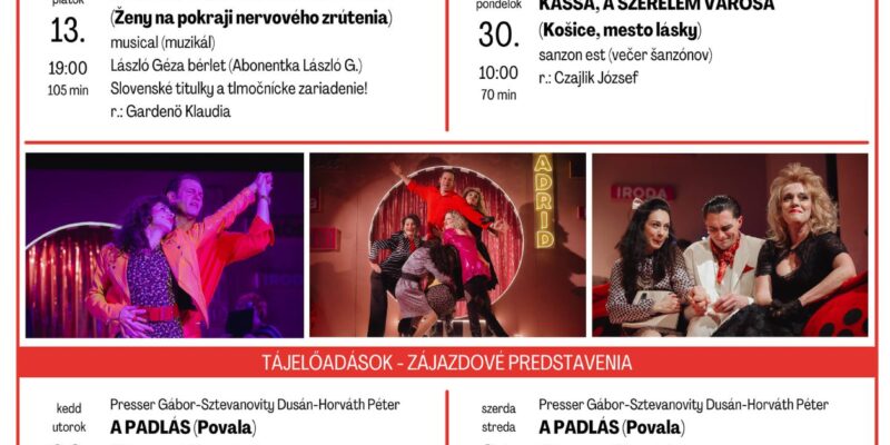 2026 február 25. 10:00 - Kassa Thália Színház: Nők az idegösszeomlás szélén Februárban egy temperamentumos, zenében és érzelmekben gazdag musical bontakozik ki... Bővebben