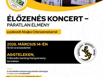 2026 március 14. 16:00 - Aggtelek A pákozdi Abajka Citerazenekar koncertje a Baradla-barlangban 2026. március 14-én, szombaton 16:00 órai kezdettel Aggteleken, a Baradla-barlang... Bővebben