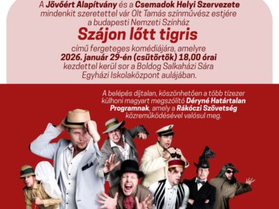 2026 január 29. 18:00 - Szepsi Szájon lőtt tigris – Olt Tamás önálló estje 2026. január 29-én, csütörtökön a Rejtő Jenő élete és művei... Bővebben