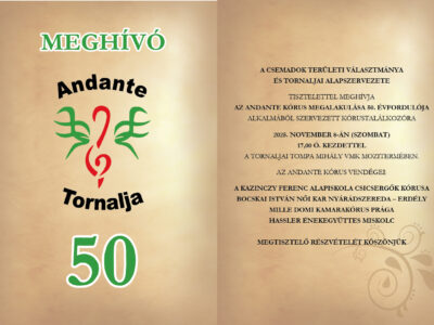 2025 november 8. 17:00 - Tornalja Kórustalálkozó az Andante Kórus megalakulásának 50. évfordulója alkalmából A Csemadok Tornaljai Területi Választmánya és Tornaljai Alapszervezete november 8-án,... Bővebben