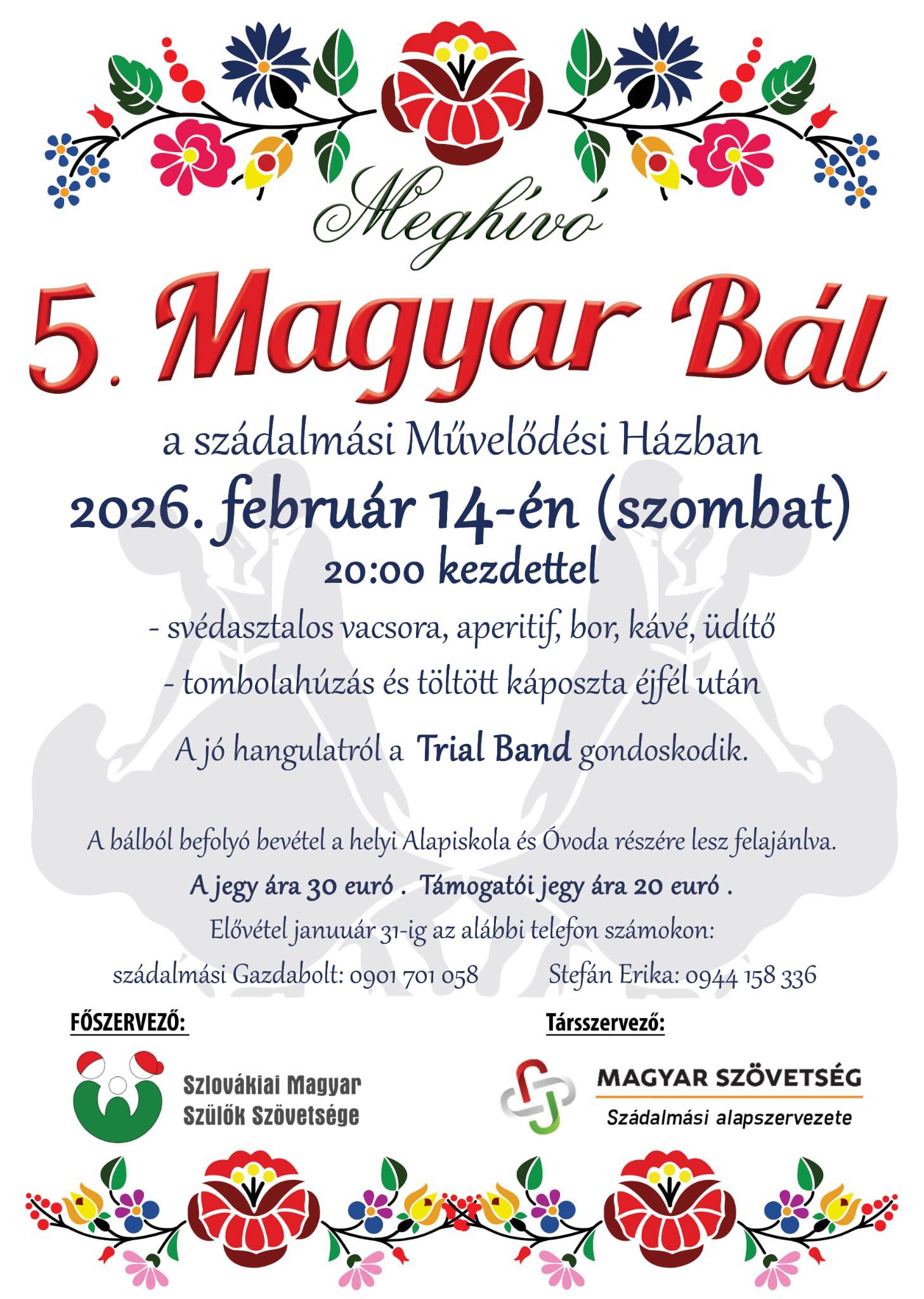 Az idei Valentin-napon, azaz február 14-én, szombaton 20:00 órától rendezik meg ötödik alkalommal a Magyar bált a szádalmási kultúrházban.