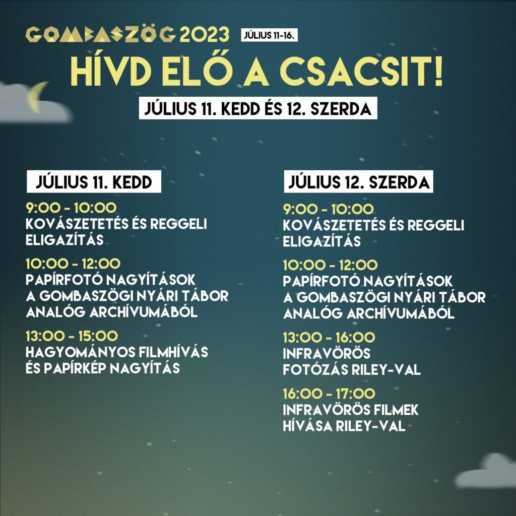 Nézzük, mivel indul az idei tábor? Kedden megkezdi működését a fotólabor, a GombaOvi, a bemutatkozás után a Rovás-pavilonban is beindul az alkotás, lehet regisztrálni a csapatjátékokra, a Labirintus Udvarban pedig a déli mindennapokról zajlik majd beszélgetés.
