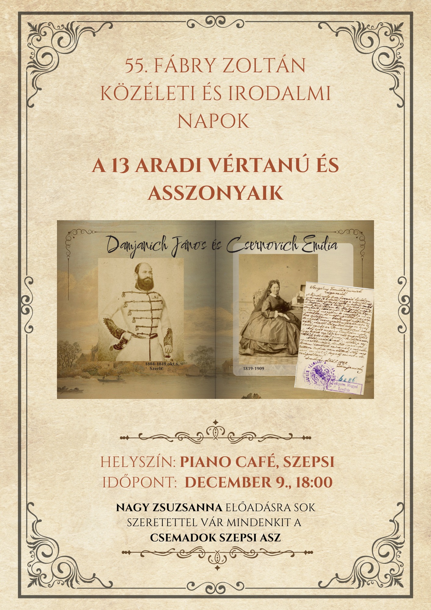 Az 55. Fábry Zoltán Közéleti és Irodalmi Napok keretében december 9-én Nagy Zsuzsanna A 13 aradi vértanú és asszonyaik című előadására várja az érdeklődőket a Csemadok Szepsi Alapszervezete.