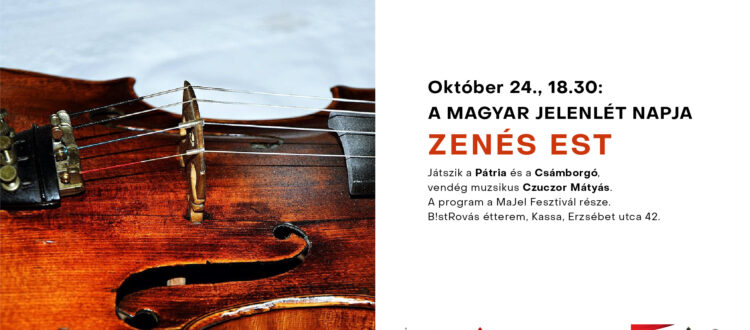 Október 24-én, pénteken, a MaJel Fesztivál keretében szervezett magyar jelenlét napján 18:30-tól zenés estet tartanak. A rendezvényen a Pátria és a Csámborgó zenekar fog játszani, a vendég muzsikus Czuczor Mátyás lesz. A helyszín a B!stRovás étterem (Kassa, Erzsébet utca 42.).