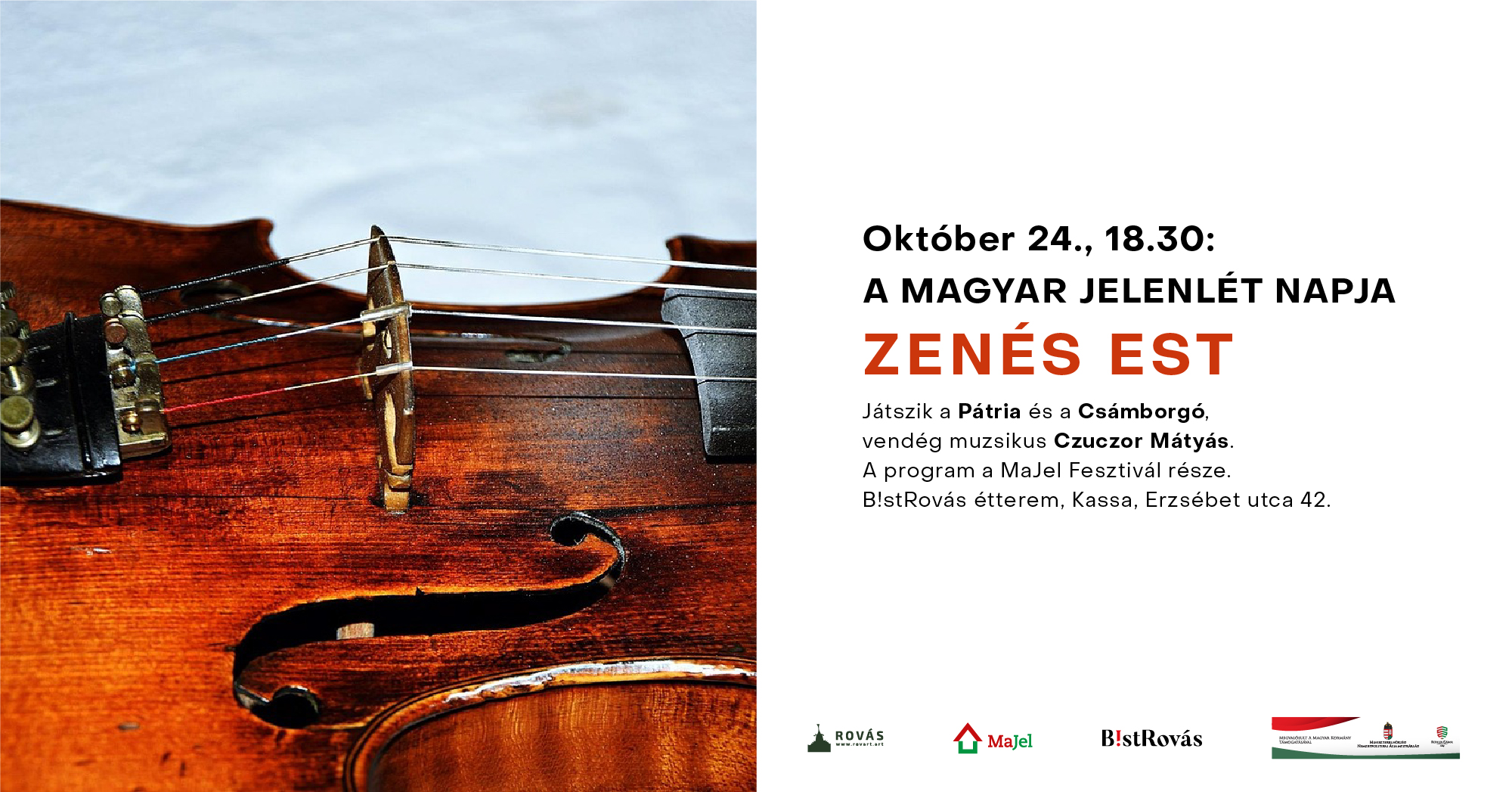 Október 24-én, pénteken, a MaJel Fesztivál keretében szervezett magyar jelenlét napján 18:30-tól zenés estet tartanak. A rendezvényen a Pátria és a Csámborgó zenekar fog játszani, a vendég muzsikus Czuczor Mátyás lesz. A helyszín a B!stRovás étterem (Kassa, Erzsébet utca 42.).