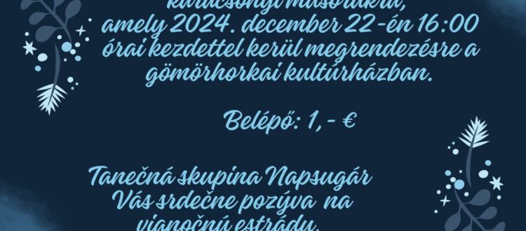 A Napsugár tánccsoport 2024. december 22-én, vasárnap 16:00 órai kezdettel mutatja be karácsonyi műsorát a gömörhorkai kultúrházban.
