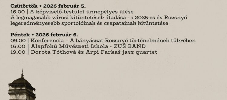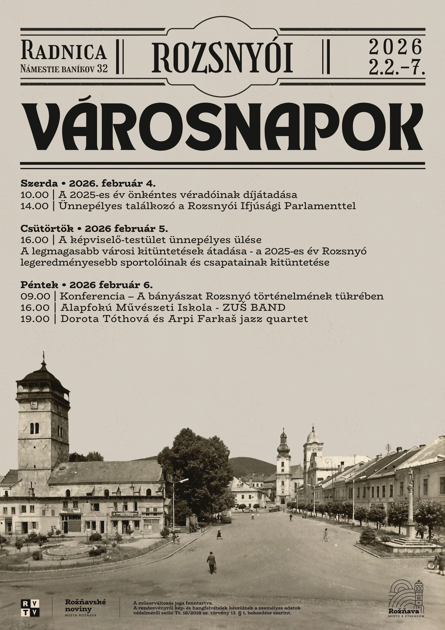 A városnapok programja 2026. február 4-én, szerdán kezdődik a történelmi városházán. Délelőtt díjazzák a 2025-ös év rozsnyói önkéntes véradóit, akiknek a város nyilvánosan köszönetet mond önzetlen segítségükért, emberségükért és azért, mert ismételten hajlandóak vért adni. Délután következik az ünnepélyes találkozó a Rozsnyói Ifjúsági Parlamenttel, melynek célja, hogy támogassa a fiatalok aktív részvételét a város életében.