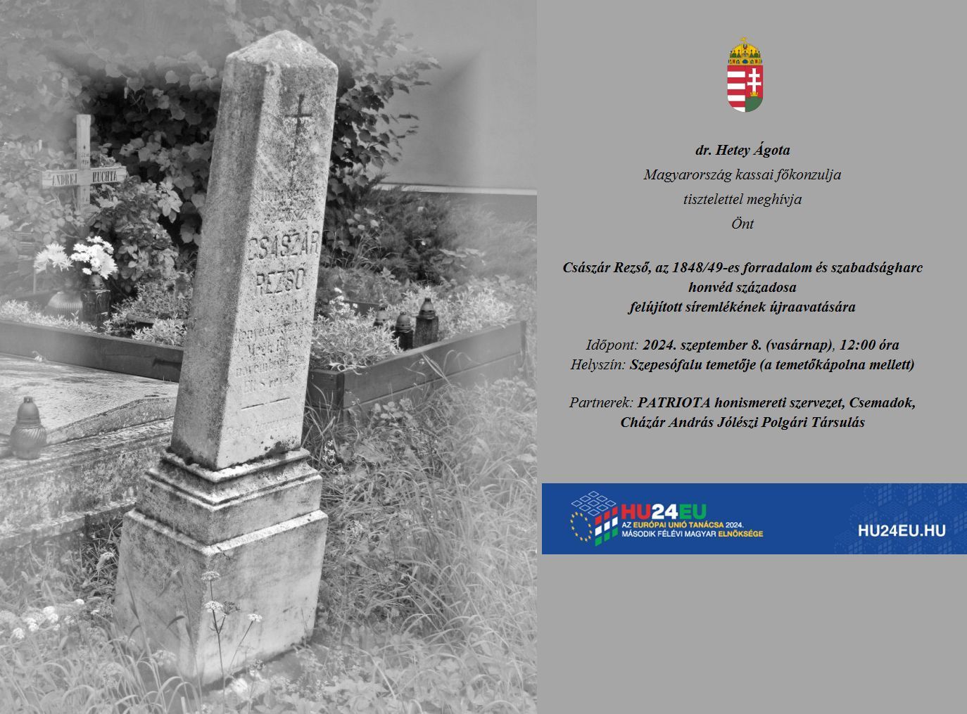 2024. szeptember 8-án, vasárnap 12:00 órától kerül sor Császár Rezső, az 1848/49-es forradalom és szabadságharc honvéd századosa felújított síremlékének újraavatására a szepesófalui temetőben.