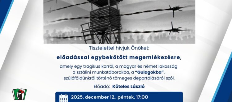 A deportálásokról, a GULAG kegyetlen világáról tart előadást Köteles László, a Csemadok országos alelnöke, a PATRIOTA honismereti szövetség elnöke 2025. december 12-én, pénteken 17:00 órától a Csemadok-székház emeleti termében, a Kovács utca 38. szám alatt Kassán.
