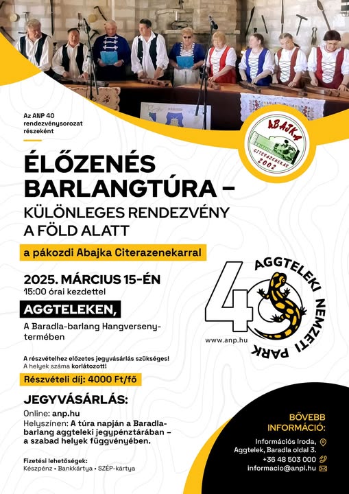 Páratlan zenei élmény az Aggteleki Nemzeti Parkban! 2025. március 15-én egy különleges, élőzenés barlangtúra indul a Baradla-barlangban, az Aggteleki rövidtúrán. A barlangi túra során a Hangversenyteremben most először élő népzene csendül fel a közel egyórás előadás során, az Abajka Citerazenekar előadásában.
