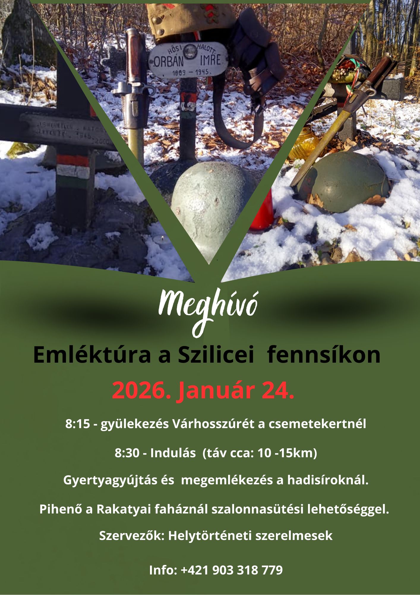A 2026. január 24-én megvalósuló gyalogtúra résztvevői megemlékeznek a második világháborús harcok befejezésének 81. évfordulójáról. A gyülekező a várhosszúréti csemetekertnél lesz 8:15-től. A túra 8:30-kor indul, a táv kb. 10-15 km. A fennsíkon a hadisíroknál a résztvevők gyertyát gyújtanak az elesett katonák emlékére. A rakattyai faháznál lesz a pihenő, szalonnasütési lehetőséggel, a hozzávalókat mindenki magának biztosítja.