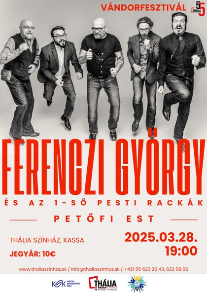 A kassai Thália Színház fennállásának 55. évfordulója alkalmából szervezett Vándorfesztivál keretében Petőfi Esttel érkezik Ferenczi György és az 1ső Pesti Rackák. Március 28-án, pénteken 19:00 órától a közönséget egy különleges est várja, ahol Petőfi versei és a magyar zenei hagyományok találkoznak a blues és a rock and roll lendületével.
