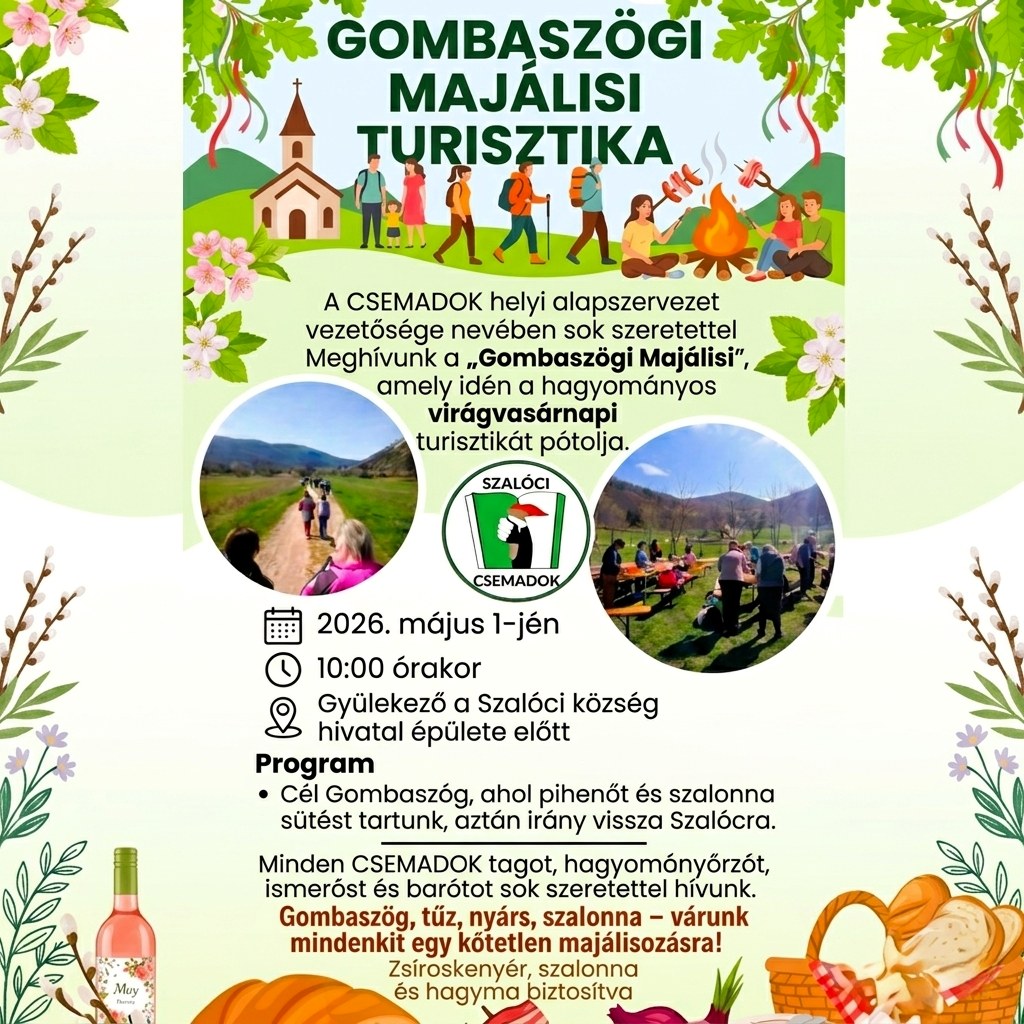 A túra 10:00 órakor indul, a gyülekező a Szalóci Községi Hivatal épülete előtt lesz. Az úticél Gombaszög, ahol a résztvevők szalonnasütés mellett pihenhetik ki a természetjárás fáradalmait.