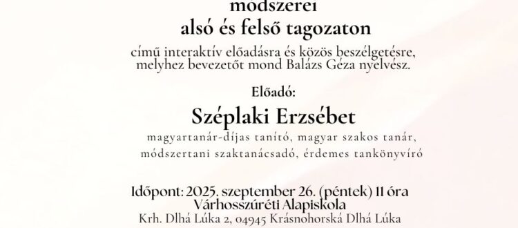 A Várhosszúréti Alapiskola egy különleges interaktív előadást és beszélgetést szervez „A szövegértő képesség fejlesztésének módszerei alsó és felső tagozaton” címmel 2025. szeptember 26-án (péntek).