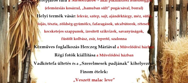 Sok finomságot és egyedi portékát kínál a helyi termékek vására, a nap folyamán a jó hangulatért a Meridián együttes felel. A programban szerepel terepjárós túra a Meseerdőbe, kézműves foglalkozás, régi fotók kiállítása, vadkörtefa ültetés és a „Szerelmesek padjának” kihelyezése.