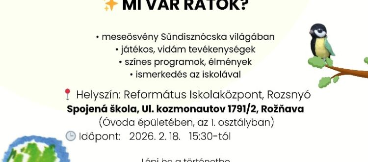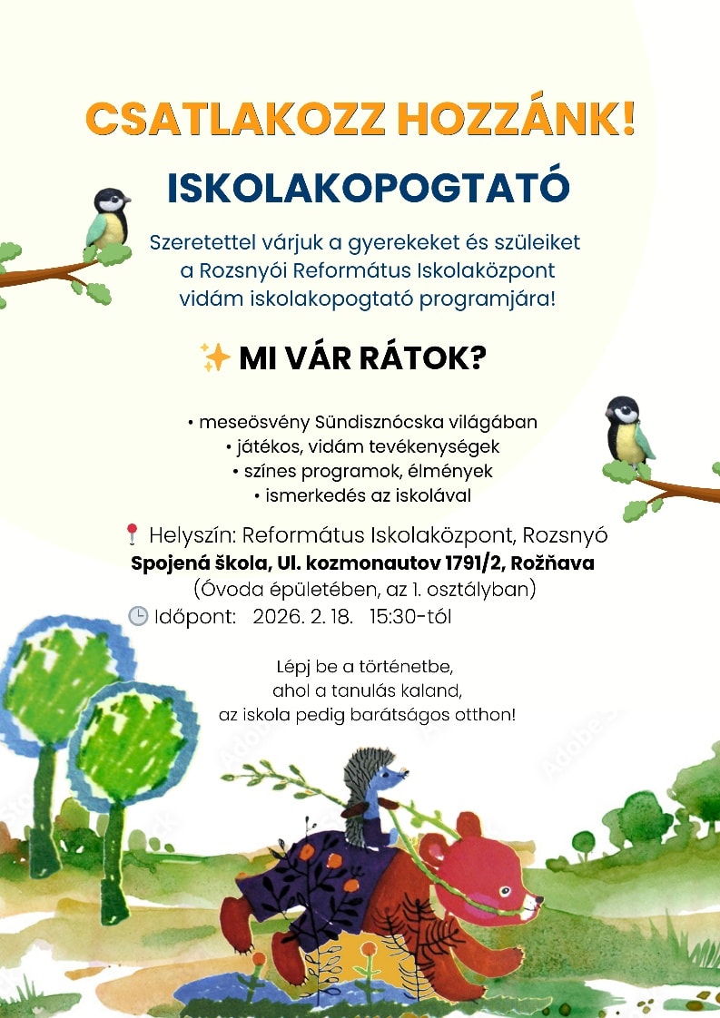 A Rozsnyói Református Iskolaközpont 2026. február 18-án 15:30-tól vidám Iskolakopogtató programot szervez a gyerekek és szüleik számára.