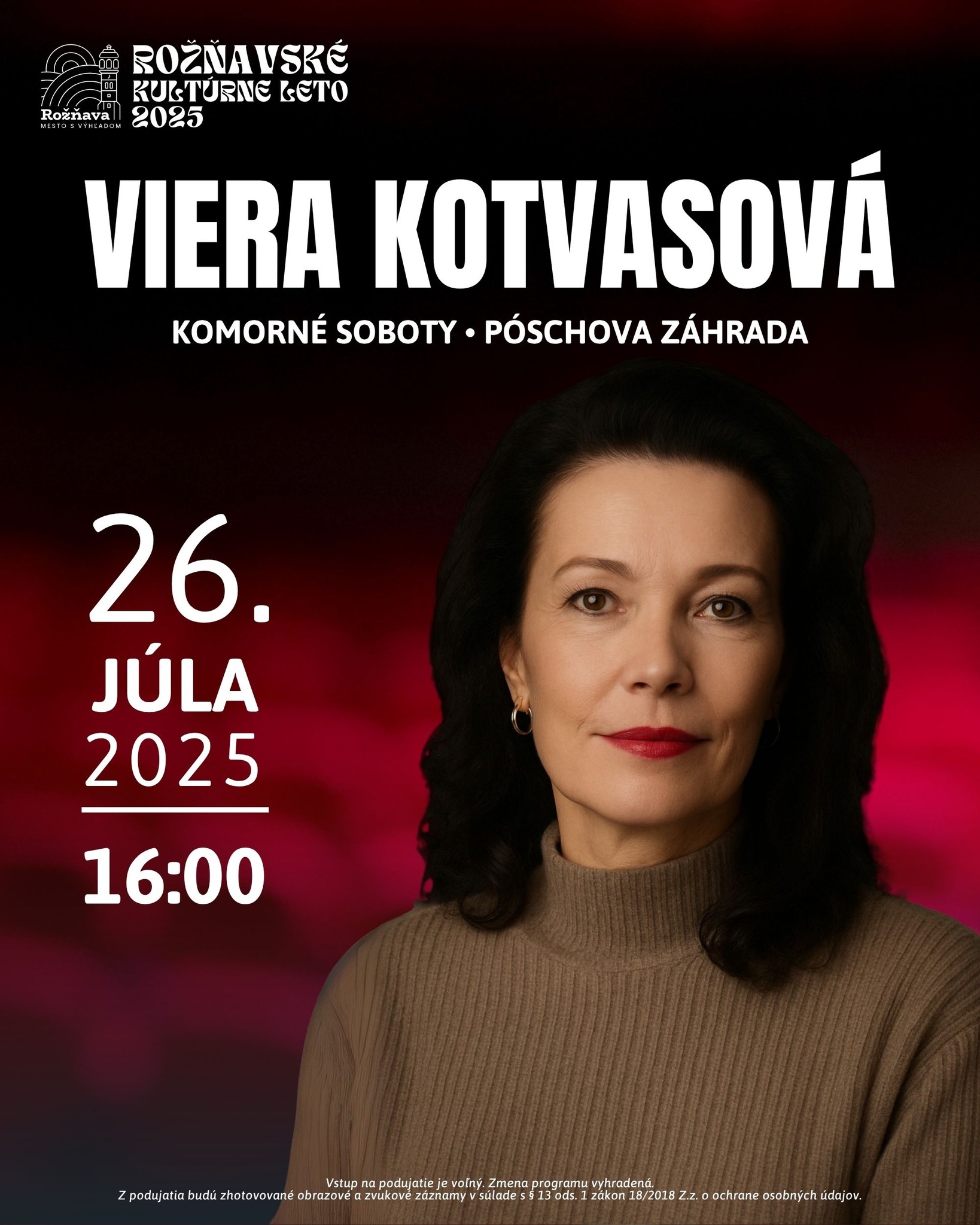 A Rozsnyói Kulturális Nyár keretében idén is szervez kamarakoncerteket a Pósch-kertben a város. Július 26-án, szombaton 16:00 órától Viera Kotvasová lesz a fellépő.