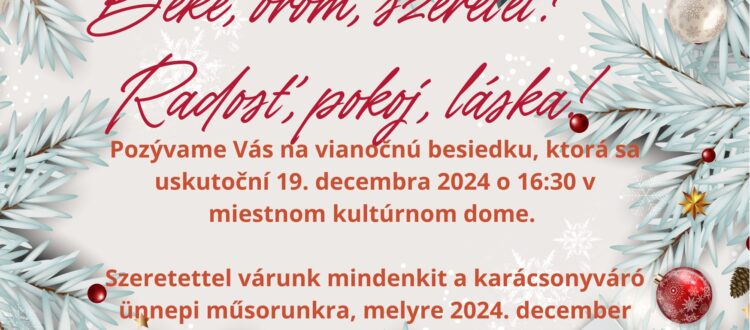 A Szilicei Alapiskola karácsonyváró ünnepi műsort szervez 2024. december 19-én, csütörtökön 16:30-tól a helyi kultúrházban.