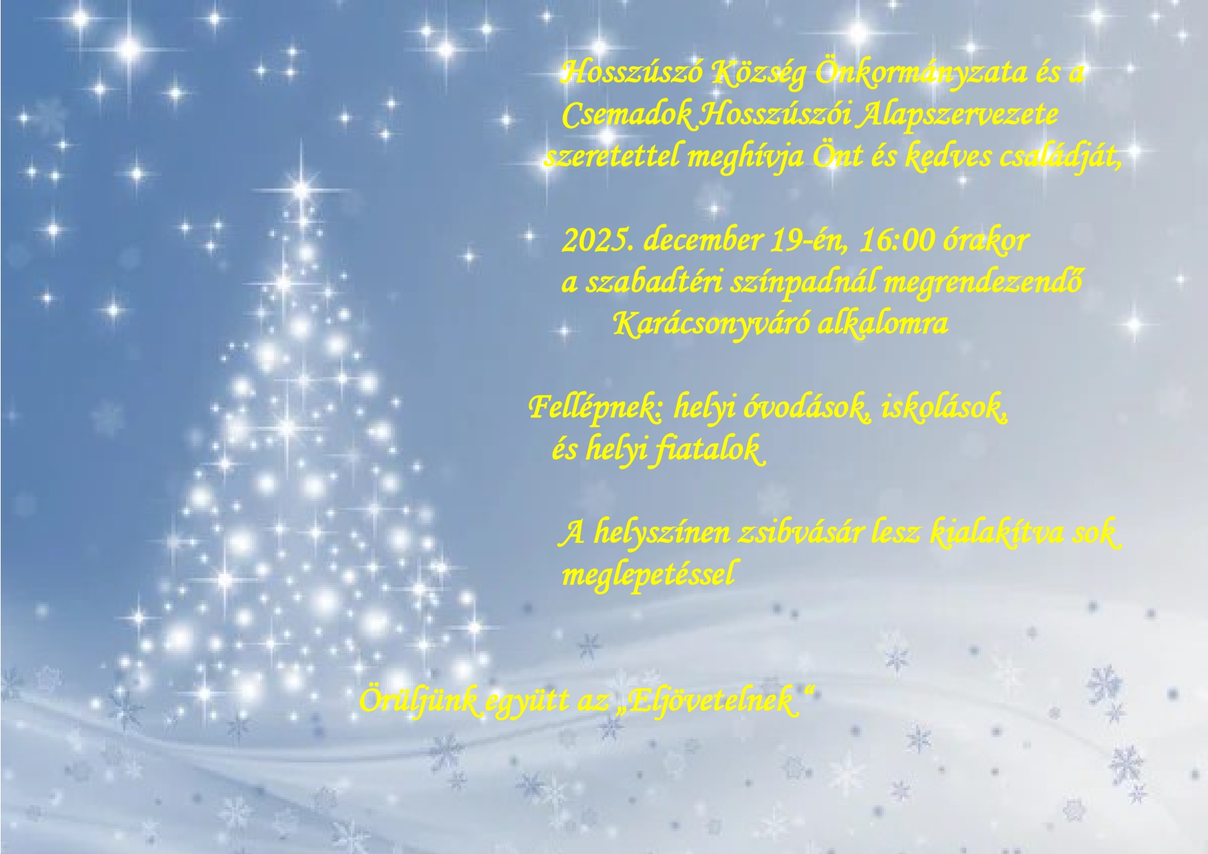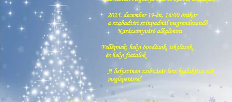 Hosszúszó Község Önkormányzata és a Csemadok Hosszúszói Alapszervezete mindenkit szeretettel vár karácsonyi rendezvényére, melyre 2025. december 19-én 16:00 órakor kerül sor a szabadtéri színpadnál.