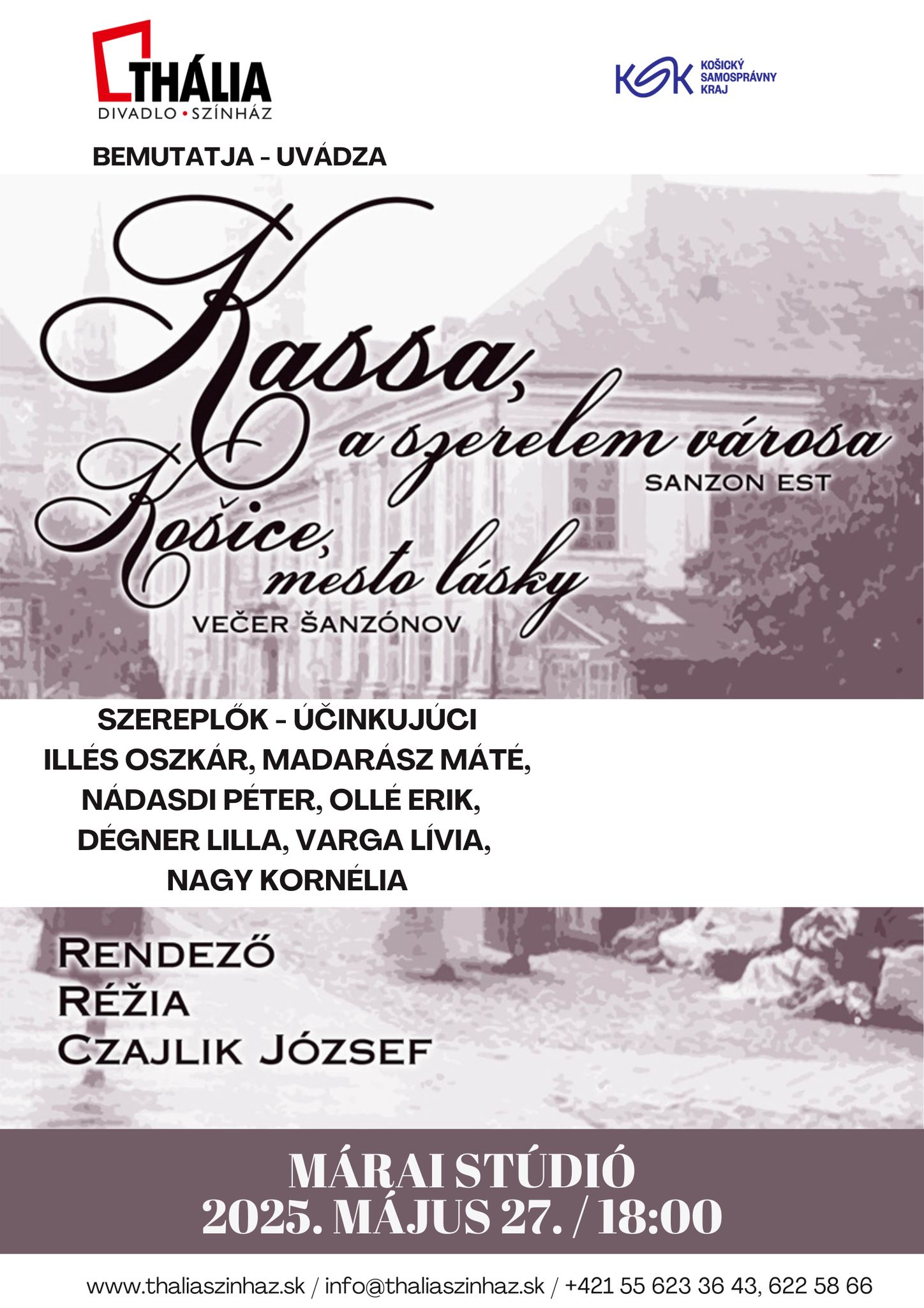 Egy város, egy történet, és számtalan érzelem… Ismét látható a Márai Stúdió színpadán a Kassa, a szerelem városa című előadás, amely különleges módon mesél Kassáról – a városról, ahol a múlt és a jelen összeér. A sanzonest május 27-én 18:00 órakor várja a közönséget.