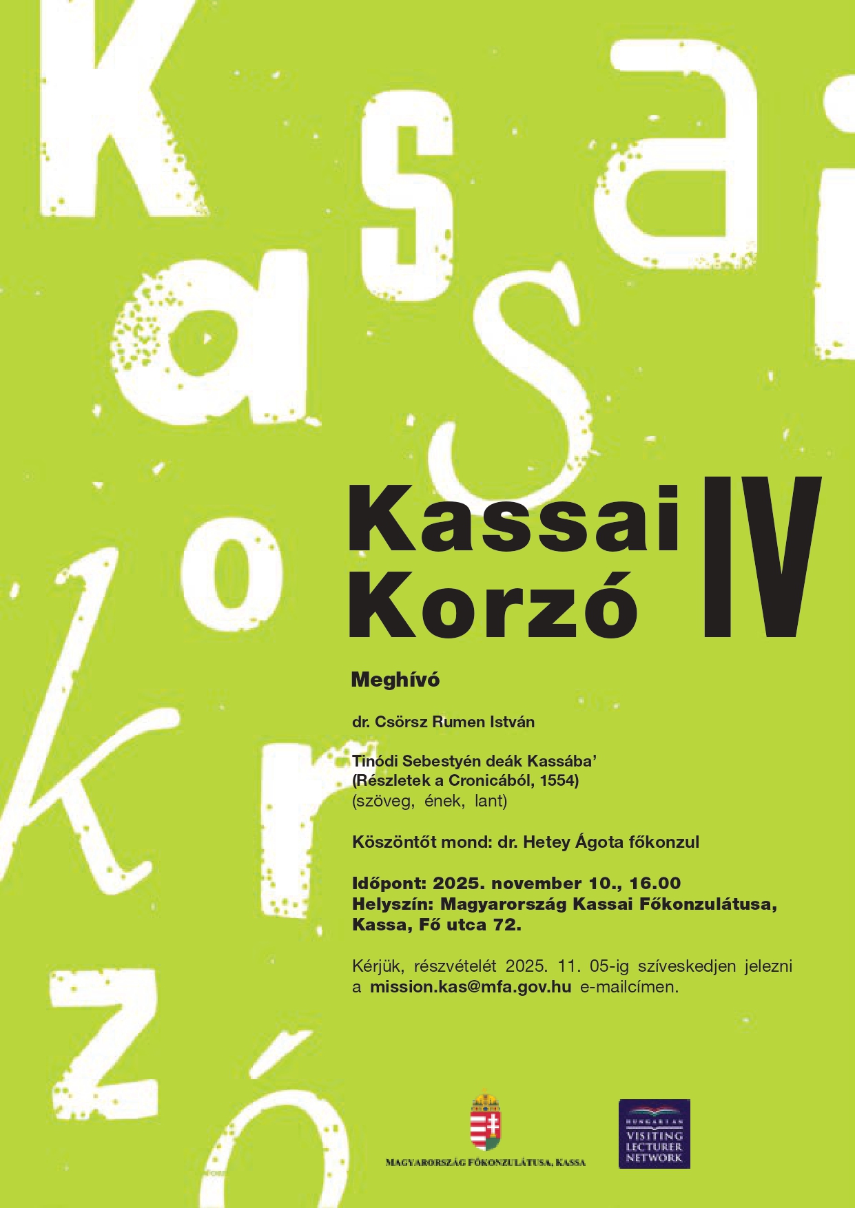 A rendezvényen, mely a Vendégoktatók a Magyar Kultúráért program keretében valósul meg, dr. Hetey Ágota főkonzul mond köszöntőt. Az érdeklődők 2025. 11. 5-ig jelezhetik részvételi szándékukat a mission.kas@mfa.gov.hu e-mail címen.