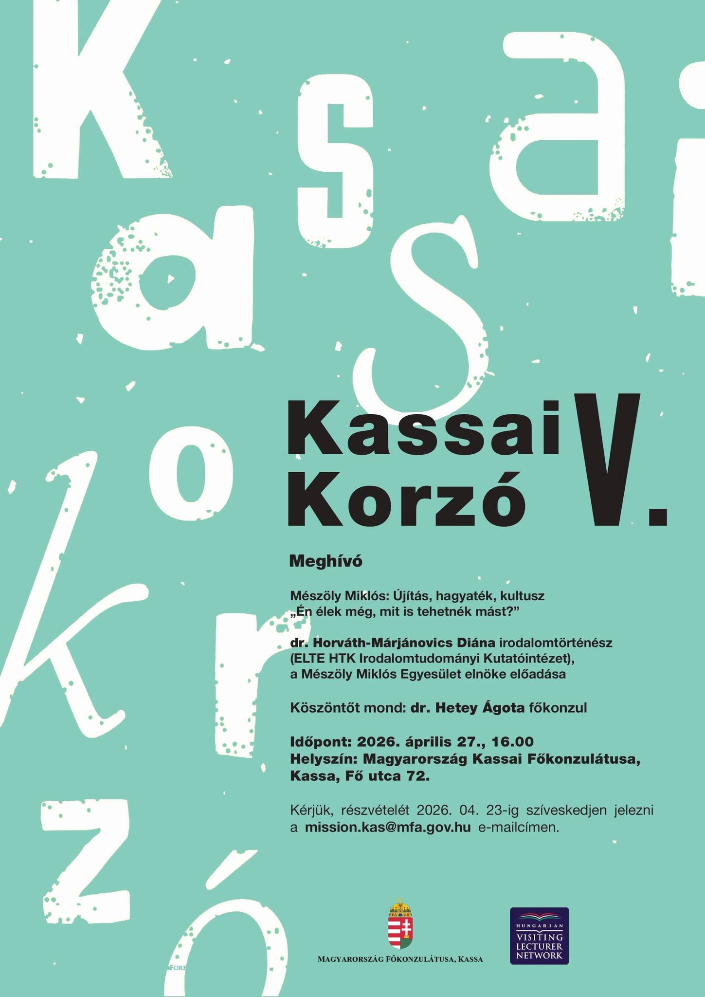 2026. április 27-én a Kassai Korzó programsorozat keretében a Mészöly Miklós: újítás, hagyaték, kultusz – „Én élek még, mit is tehetnék mást?” című előadás várja az érdeklődőket Magyarország Kassai Főkonzulátusán. Az előadó dr. Horváth-Márjánovics Diána irodalomtörténész, az ELTE HTK Irodalomtudományi Kutatóintézetének munkatársa, a Mészöly Miklós Egyesület elnöke.