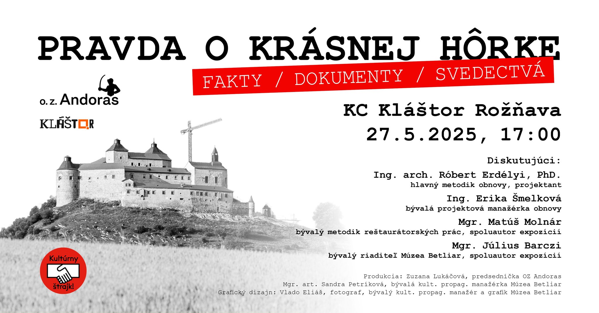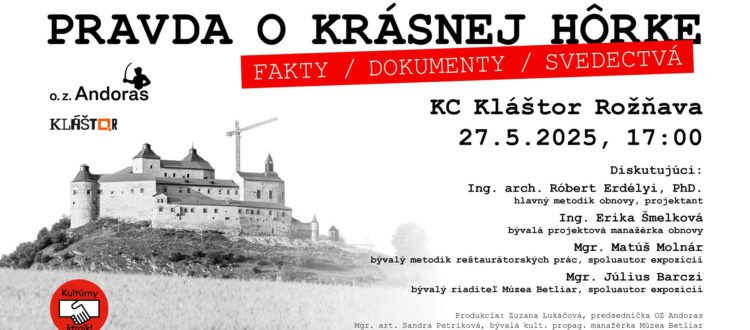 Május 27-én 17:00 órától a rozsnyói KC Kláštor (Kolostor közösségi központ) ad otthont az Andoras polgári társulás által szervezett, Az igazság a krasznahorkai várról című beszélgetésnek. Az est vendége lesz Ing. arch. Róbert Erdélyi, Phd., tervező, a felújítás fő módszertani vezetője, Ing. Erika Šmelková, a várfelújítás volt projektmenedzsere, Mgr. Matúš Molnár, a restaurálási munkák korábbi módszertani felelőse, a kiállítások társszerzője, valamint Mgr. Július Barczi, a Betléri Múzeum volt igazgatója, a kiállítások társszerzője.