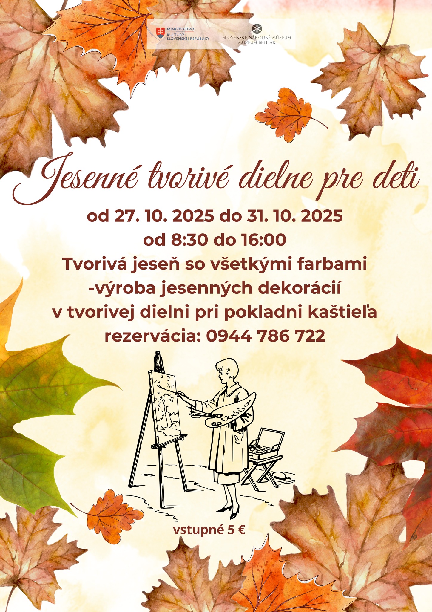 A kreatív program naponta 8:30-tól 16:00 óráig várja a kicsiket a betléri kastély pénztára melletti alkotóműhelyben, ahol őszi díszeket fognak készíteni. A részvételi díj 5€.