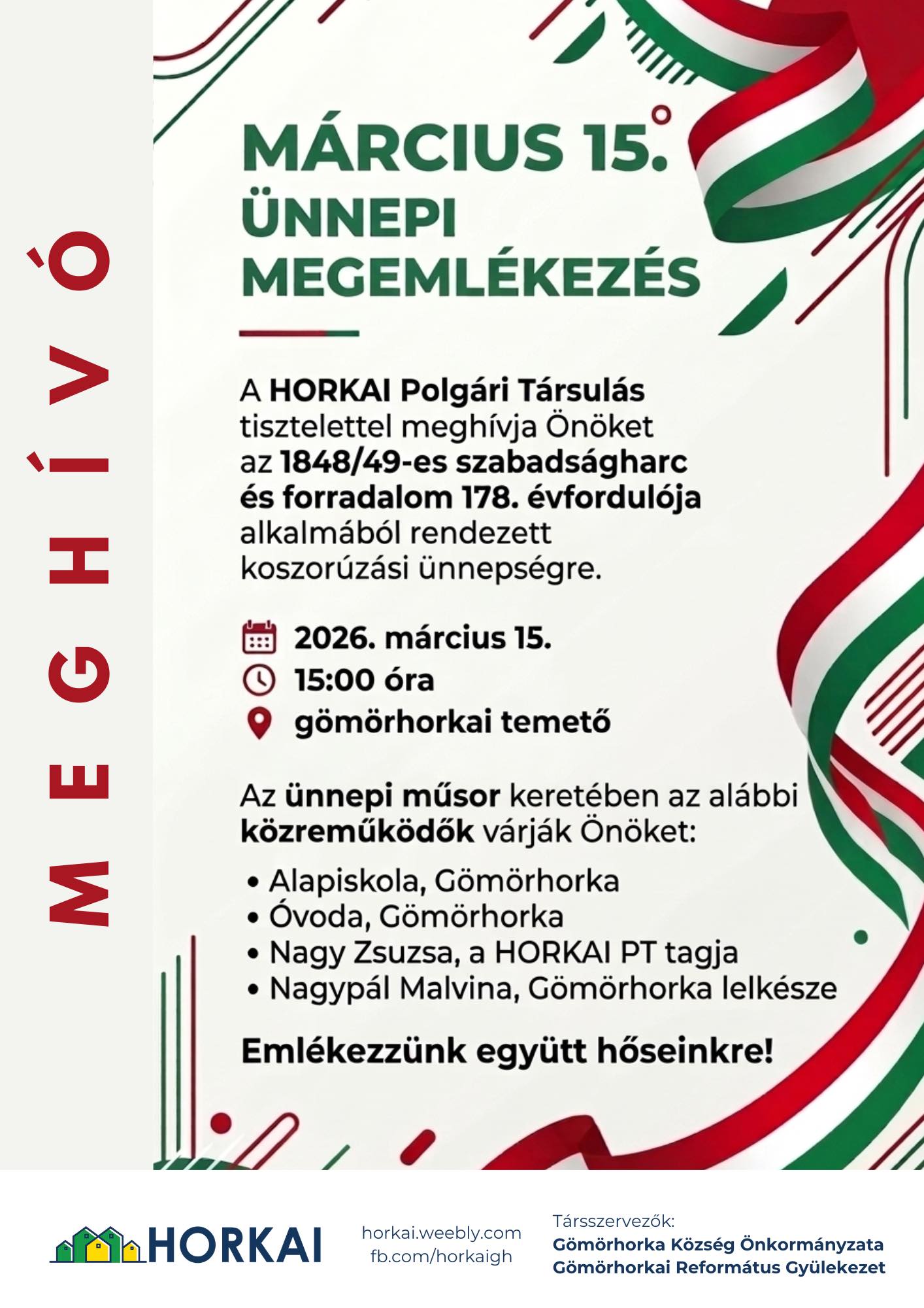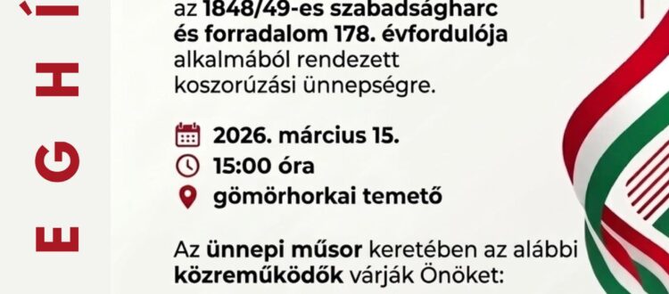A HORKAI Polgári Társulás Gömörhorka Község Önkormányzata és a Gömörhorkai Református Gyülekezet társszervezésében 2026. március 15-én, vasárnap délután 15:00 órától koszorúzási ünnepséget szervez a gömörhorkai temetőben az 1848/49-es magyar szabadságharc és forradalom 178. évfordulója alkalmából.