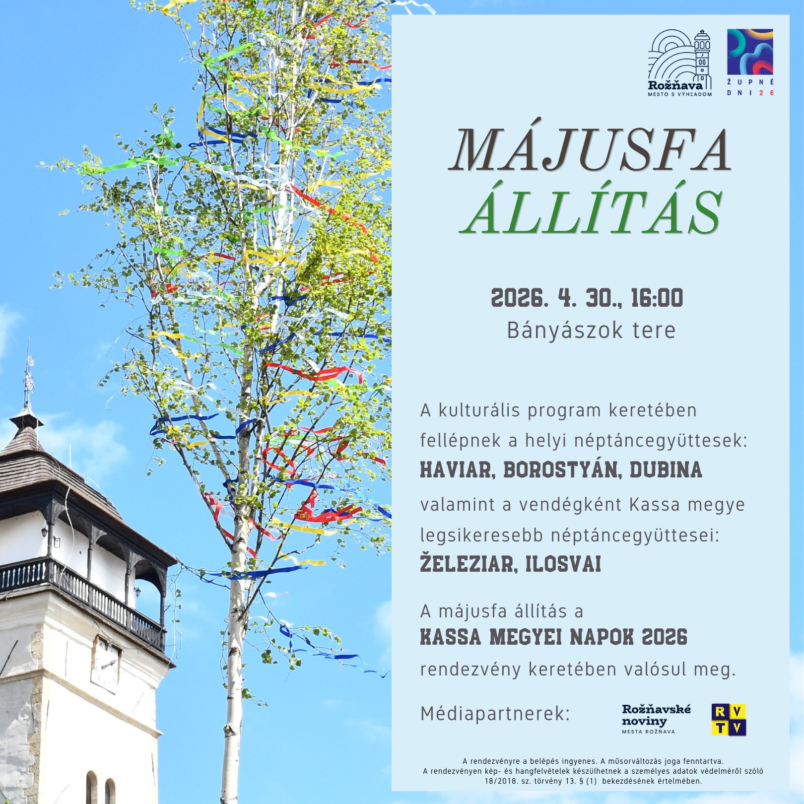 Április 30-án, a Kassa Megyei Napok rendezvénysorozat részeként kerül sor a hagyományos májusfaállításra Rozsnyó főterén.